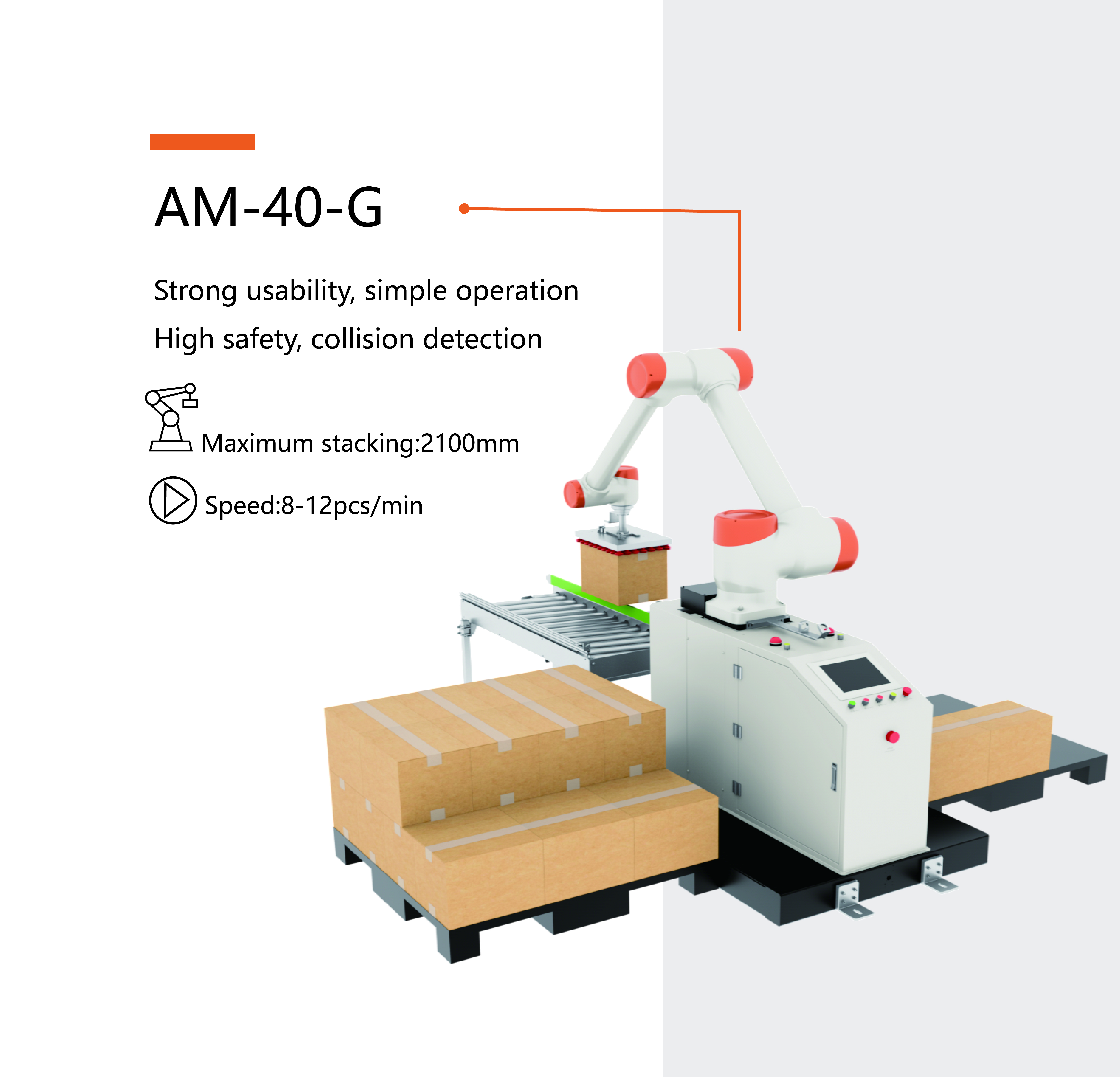 近日,经过多轮精心打磨和应用沉淀,AM-40-G协作码垛系列新品重磅问世。它精细瞄准汽车、新能源、食品、农业、化工等行业的货物码垛需求,开启规模出货。